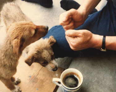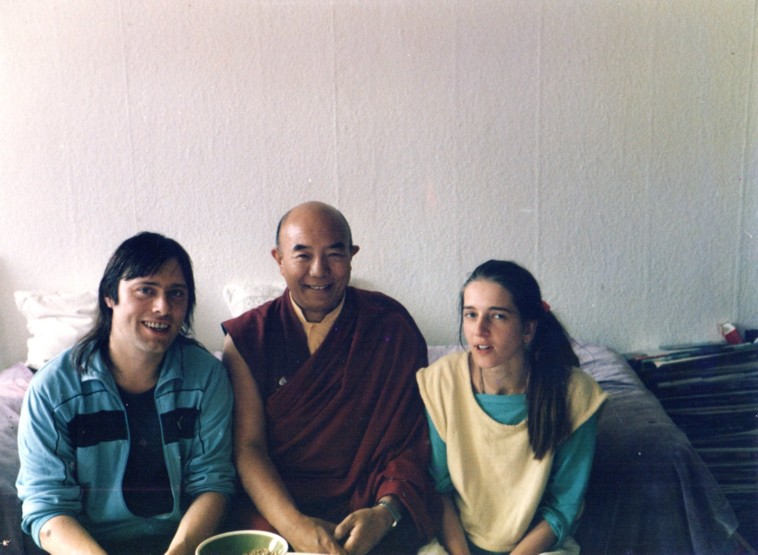 Tenga Rinpoche zu Besuch bei Lama John im ersten Tenga Zentrum Karma Gyurme Gyamtso Ling in Berlin, 1985, zusammen mit Lama John`s Retreathelferin Beate Freihold .